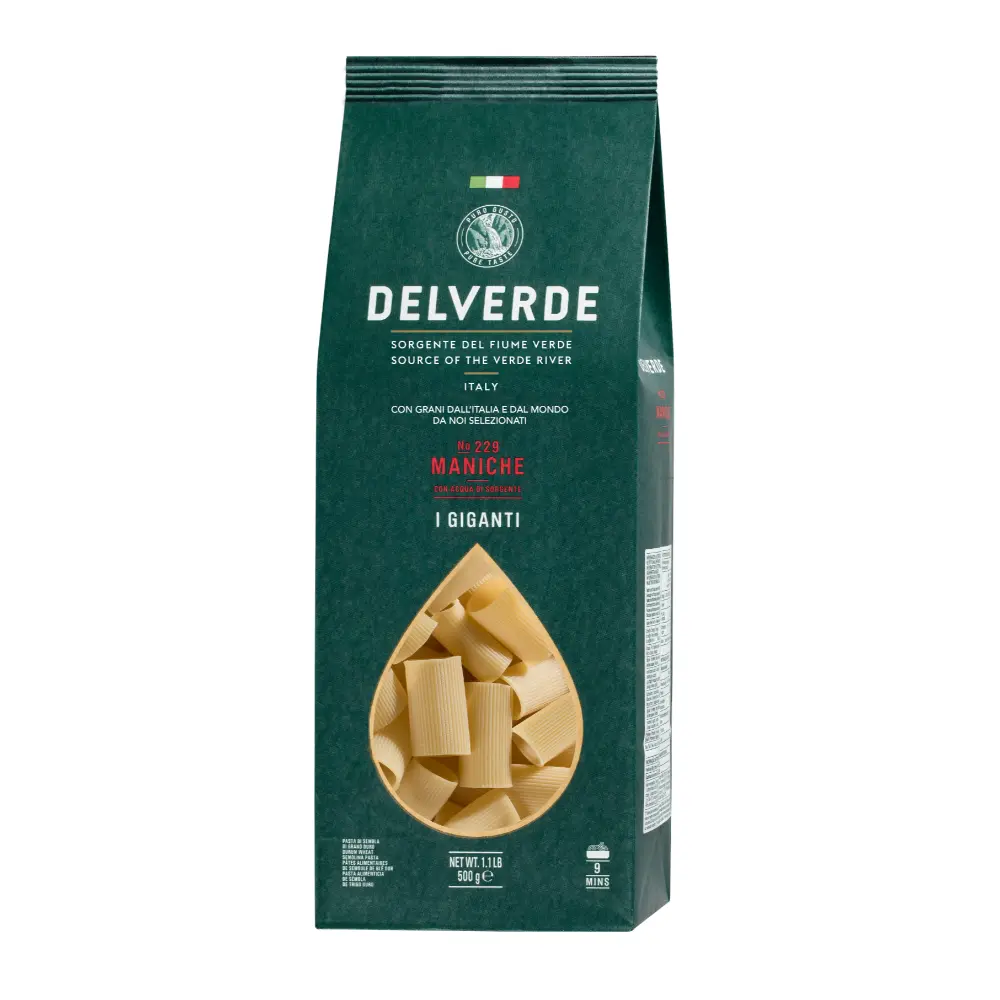 Pasta di semola fatta con acqua pura di sorgente e grano duro accuratamente selezionato tra i migliori grani prevalentemente dall’Italia e dal mondo. La trafilatura ruvida e lenta essicazione a basse temperature conferiscono a questa pasta un carattere unico, per un’ottima resa in cottura, perfetta consistenza e masticabilità.