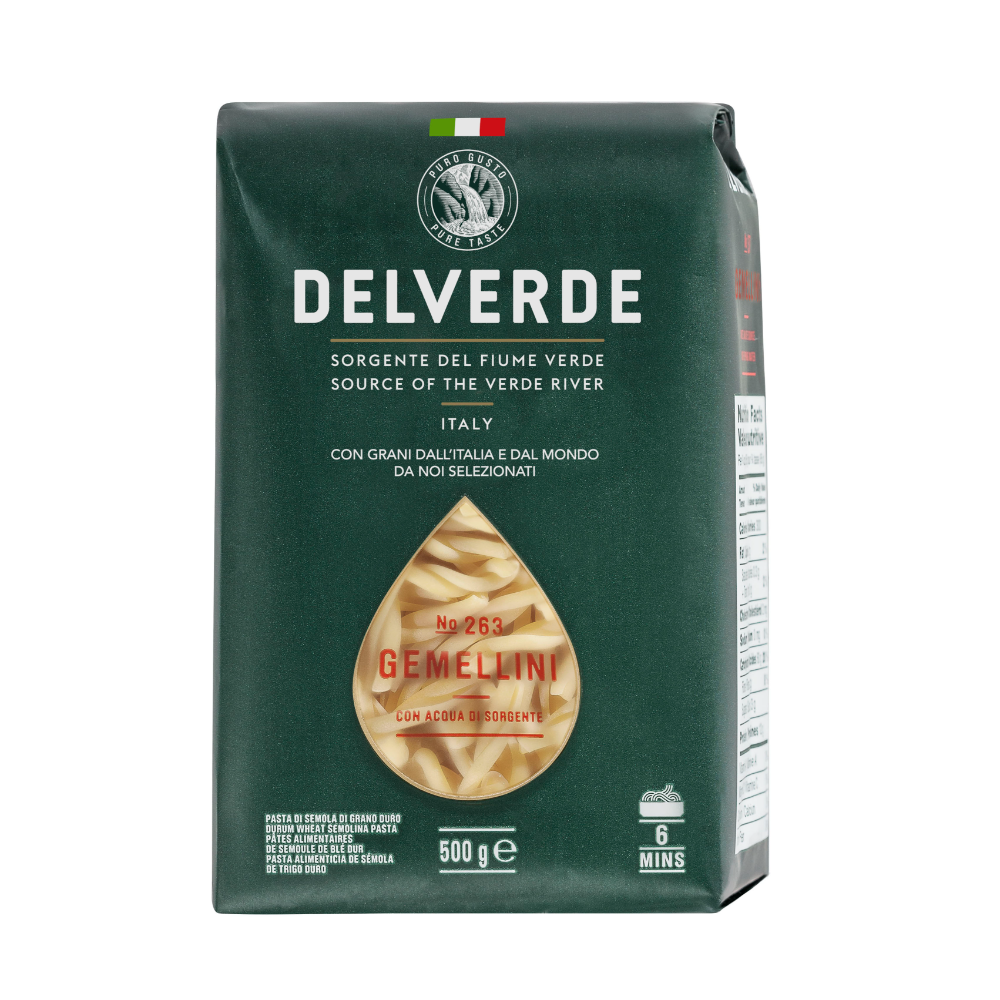 Pasta di semola fatta con acqua pura di sorgente e grano duro accuratamente selezionato tra i migliori grani prevalentemente dall’Italia e dal mondo. La trafilatura ruvida e lenta essicazione a basse temperature conferiscono a questa pasta un carattere unico, per un’ottima resa in cottura, perfetta consistenza e masticabilità.