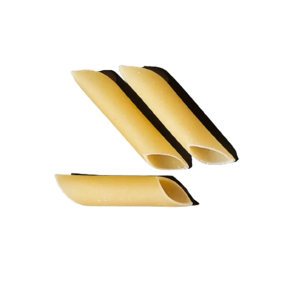 Pasta di semola fatta con acqua pura di sorgente e grano duro accuratamente selezionato tra i migliori grani prevalentemente dall’Italia e dal mondo. La trafilatura ruvida e lenta essicazione a basse temperature conferiscono a questa pasta un carattere unico, per un’ottima resa in cottura, perfetta consistenza e masticabilità.