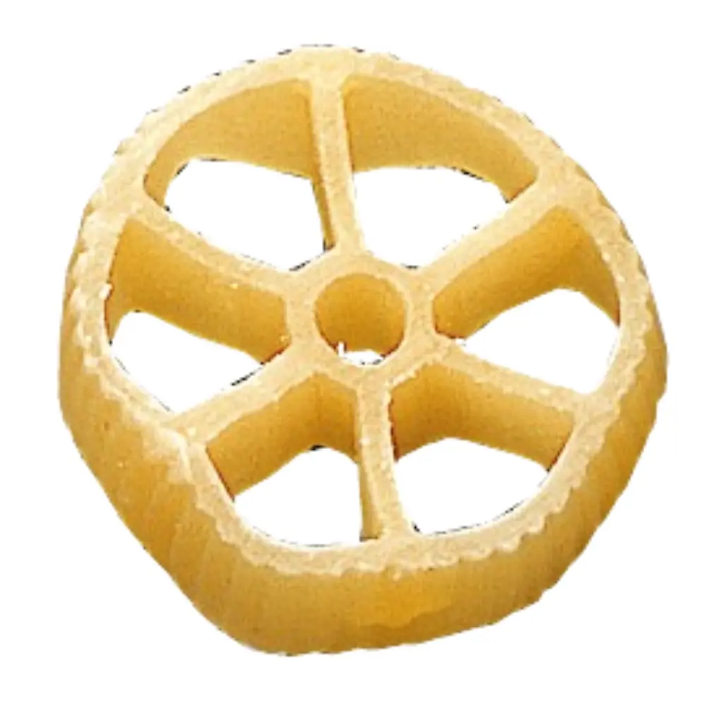 Pasta di semola fatta con acqua pura di sorgente e grano duro accuratamente selezionato tra i migliori grani prevalentemente dall’Italia e dal mondo. La trafilatura ruvida e lenta essicazione a basse temperature conferiscono a questa pasta un carattere unico, per un’ottima resa in cottura, perfetta consistenza e masticabilità.