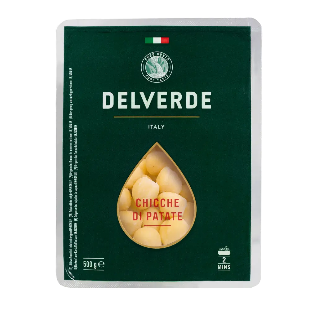 Gustose e morbide al punto giusto, fatte con l’80% di patate, le chicche Delverde cuociono in appena 2 minuti. Si adattano perfettamente sia alle preparazioni di tutti i giorni che alle ricette più eleborate, sia ai condimenti bianchi che a quelli rossi.