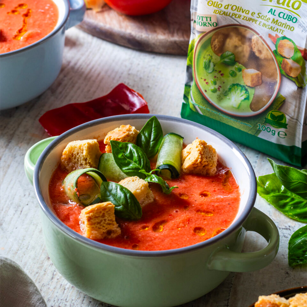 Pomodori, peperoni e cetrioli frullati per una zuppa fresca e sana che con il suo colore brillante mette appetito e allegria. Da servire nelle classiche cocotte o in bicchierini per un aperitivo diverso dal solito.