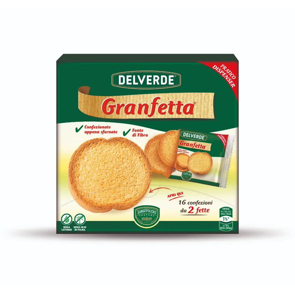 Granfetta mantiene tutta la sua fragranza con la pratica confezione salvafreschezza: in ogni pacchetto, due fette di croccante bontà.